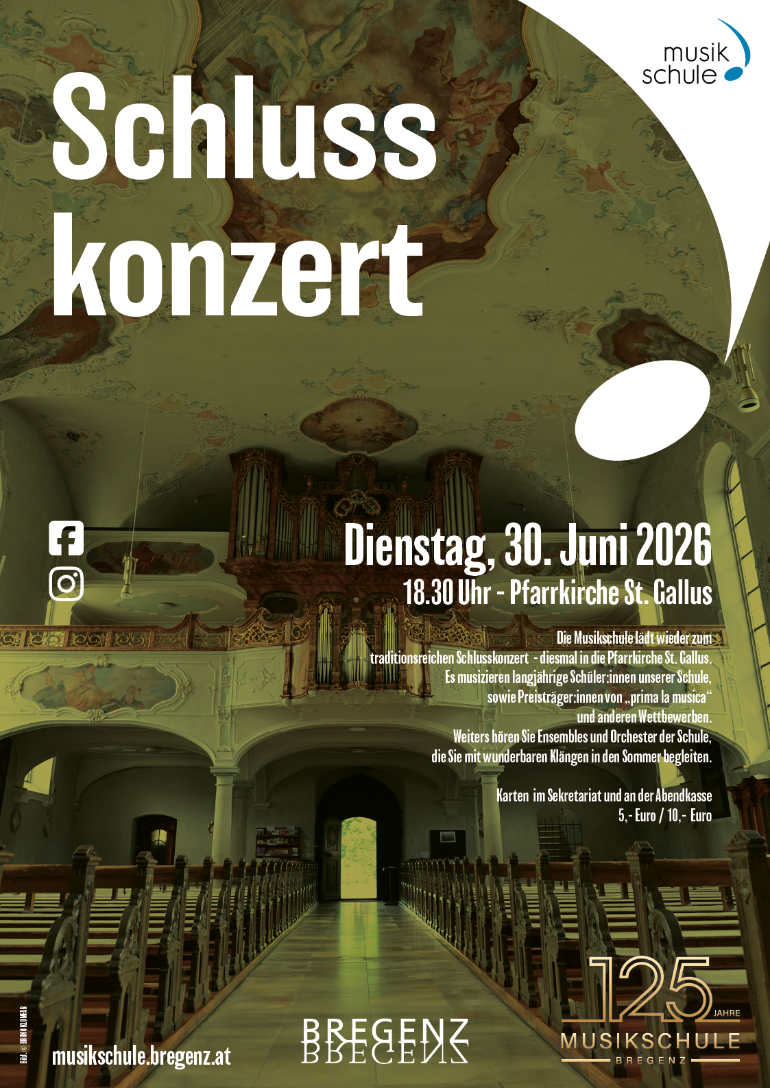 Die Musikschule lädt wieder zum traditionsreichen Schlusskonzert – diesmal in die Pfarrkirche St. Gallus. Es musizieren langjährige Schüler:innen unserer Schule, sowie Preisträger:innen von „prima la musica“ und anderen Wettbewerben. Weiters hören Sie Ensembles und Orchester der Schule, die Sie mit wunderbaren Klängen in den Sommer begleiten.